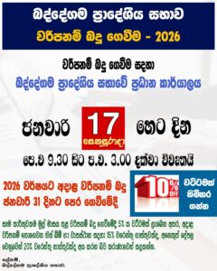 Baddegama Pradeshiya Sabha Payment of Assessment Tax – 2026 For your convenience, the head office of the Baddegama Pradeshiya Sabha will be open tomorrow (17) Saturday from 9.30 am to 3.00 pm. Pay your assessment tax for the year 2026 before January 31st and get a 10% discount.