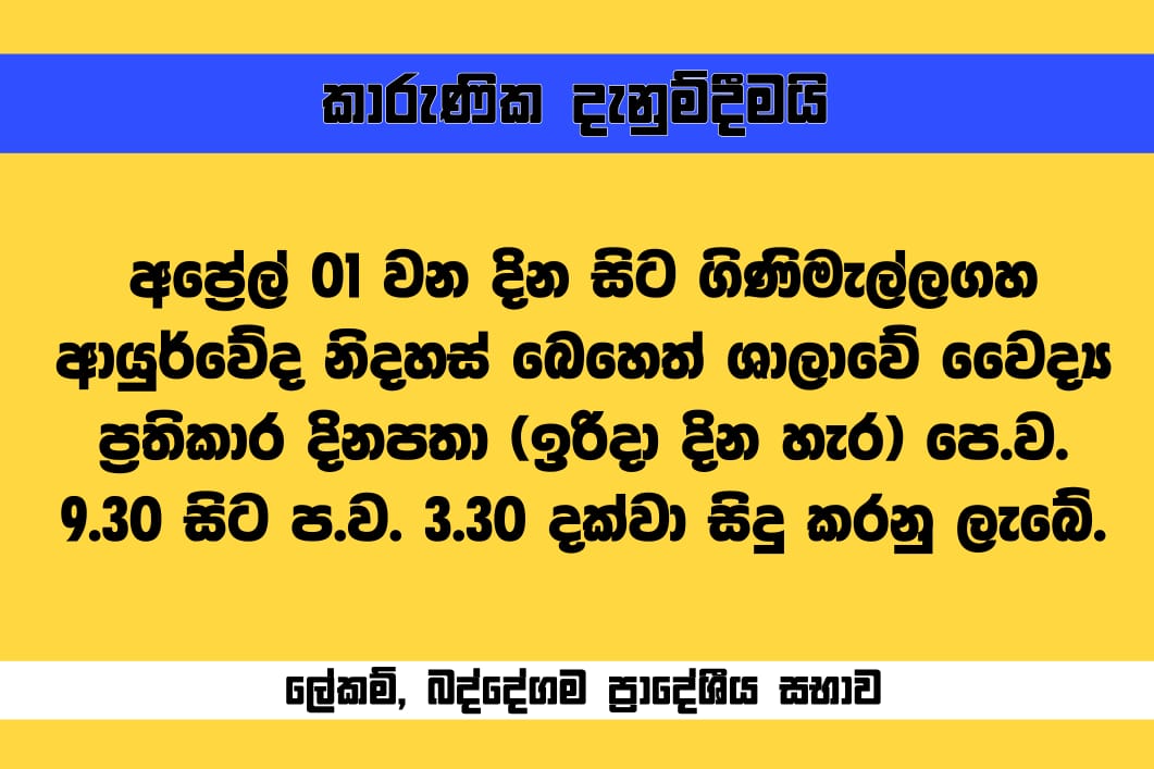 2025 සැප්තැම්බර් 15 දිනෙන් ආරම්භ කරනු ලබන “පළාත් පාලන සතිය” වැඩසටහන් පෙලට සමගාමීව බද්දේගම ප්රාදේශීය සභාව විසින් සංවිධානය කරනු ලබන ආයූර්වේද වෛද්ය සායනය 2025 සැප්තැම්බර් 15 දින පෙ.ව. 9.00 සිට ප.ව. 2.00 දක්වා වඳුරඹ නගර ශාලා පරිශ්රයේදී. රෝගීන් පරීක්ෂාව හා ආයූර්වේද වෛද්ය උපදෙස් ලබාදීම. ආයූර්වේද ඖෂධ නිකුත් කිරීම. (ඖෂධ රැගෙන යාම සදහා පිරිසිදු බෝතල් රැගෙන… Continue reading බද්දේගම ප්රාදේශීය සභාව විසින් සංවිධානය කරනු ලබන ආයූර්වේද වෛද්ය සායනය 2025 සැප්තැම්බර් 15 දින පෙ.ව. 9.00 සිට ප.ව. 2.00 දක්වා වඳුරඹ නගර ශාලා පරිශ්රයේදී.