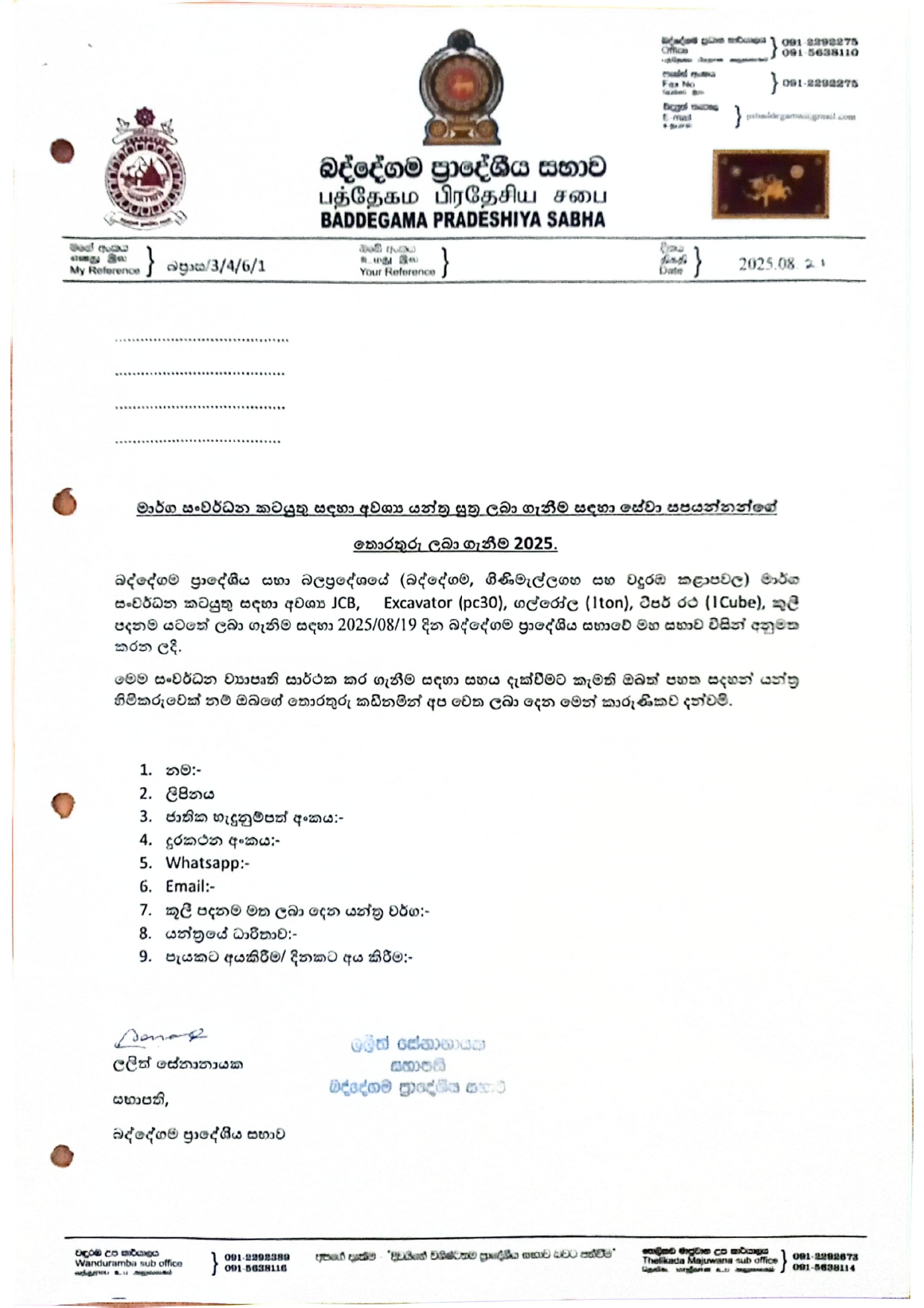 මාර්ග සංවර්ධන කටයුතු සඳහා අවශ්ය යන්ත්ර සූත්ර ලබා ගැනීම සඳහා සේවා සපයන්නන්ගේ තොරතුරු ලබා ගැනීම – 2025. බද්දේගම ප්රාදේශීය සභා බල ප්රදේශයේ (බද්දේගම, ගිණිමැල්ලගහ සහ වදුරඹ කළාපවල) මාර්ග සංවර්ධන කටයුතු සඳහා අවශ්ය JCB, Excavator (pc30), ගෆ්රෝල (lton), ටීපර් රථ (ICube), කුලී පදනම යටතේ ලබා ගැනිම සඳහා 2025/08/19 දින බද්දේගම ප්රාදේශීය සභාවේ, මහ සභාව විසින් අනුමත… Continue reading මාර්ග සංවර්ධන කටයුතු සඳහා අවශ්ය යන්ත්ර සූත්ර ලබා ගැනීම සඳහා සේවා සපයන්නන්ගේ තොරතුරු ලබා ගැනීම – 2025.