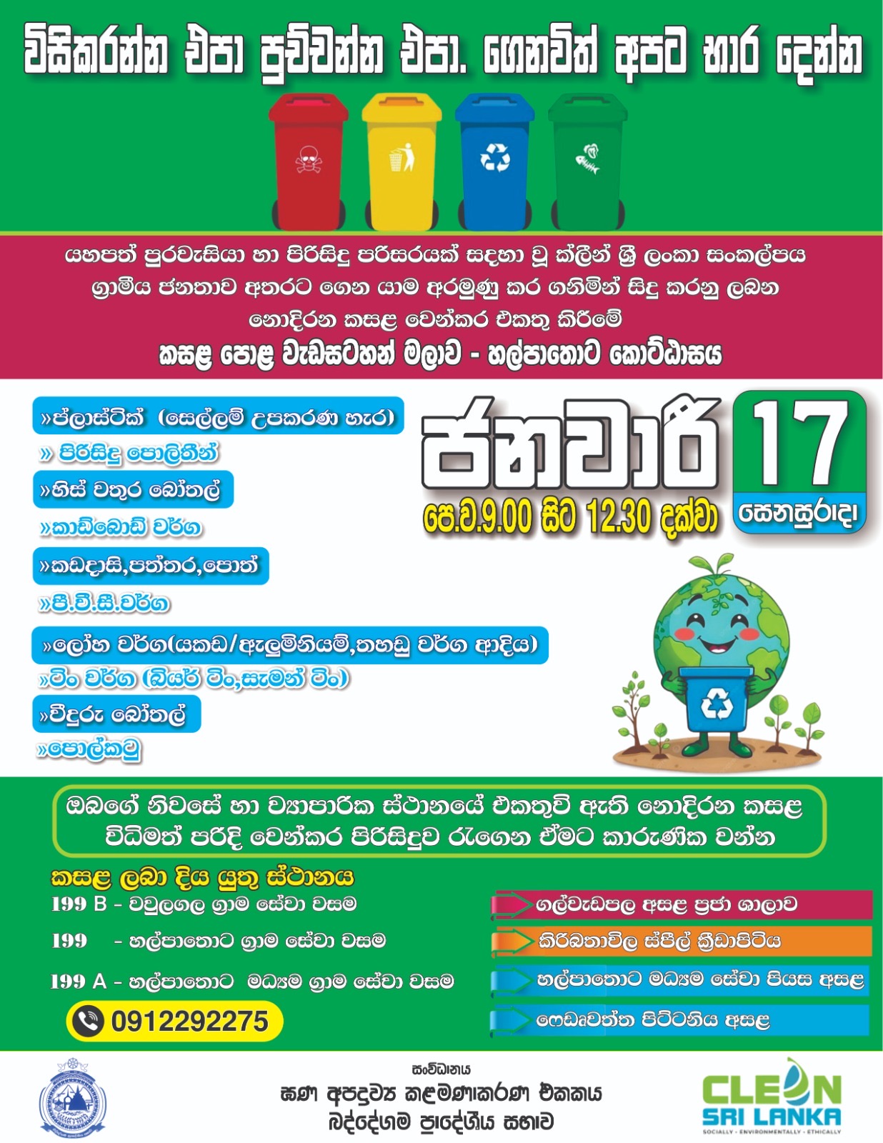 The first program of the series of ”Garbage Fair” programs, which is being conducted under the full guidance and supervision of the Honorable Chairman of the Baddegama Pradeshiya Sabha, Mr. Lalith Senanayake, with the coordination of the Honorable Members of the Pradeshiya Sabha and with the participation of community-based organizations in the area, will be held in Halpathota Division on 2026.01.17, that is, tomorrow from 9.00 a.m. to 12.30 p.m.